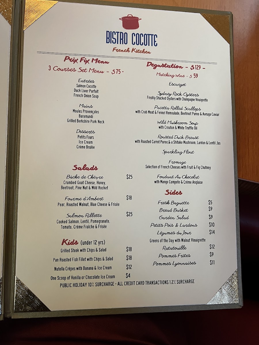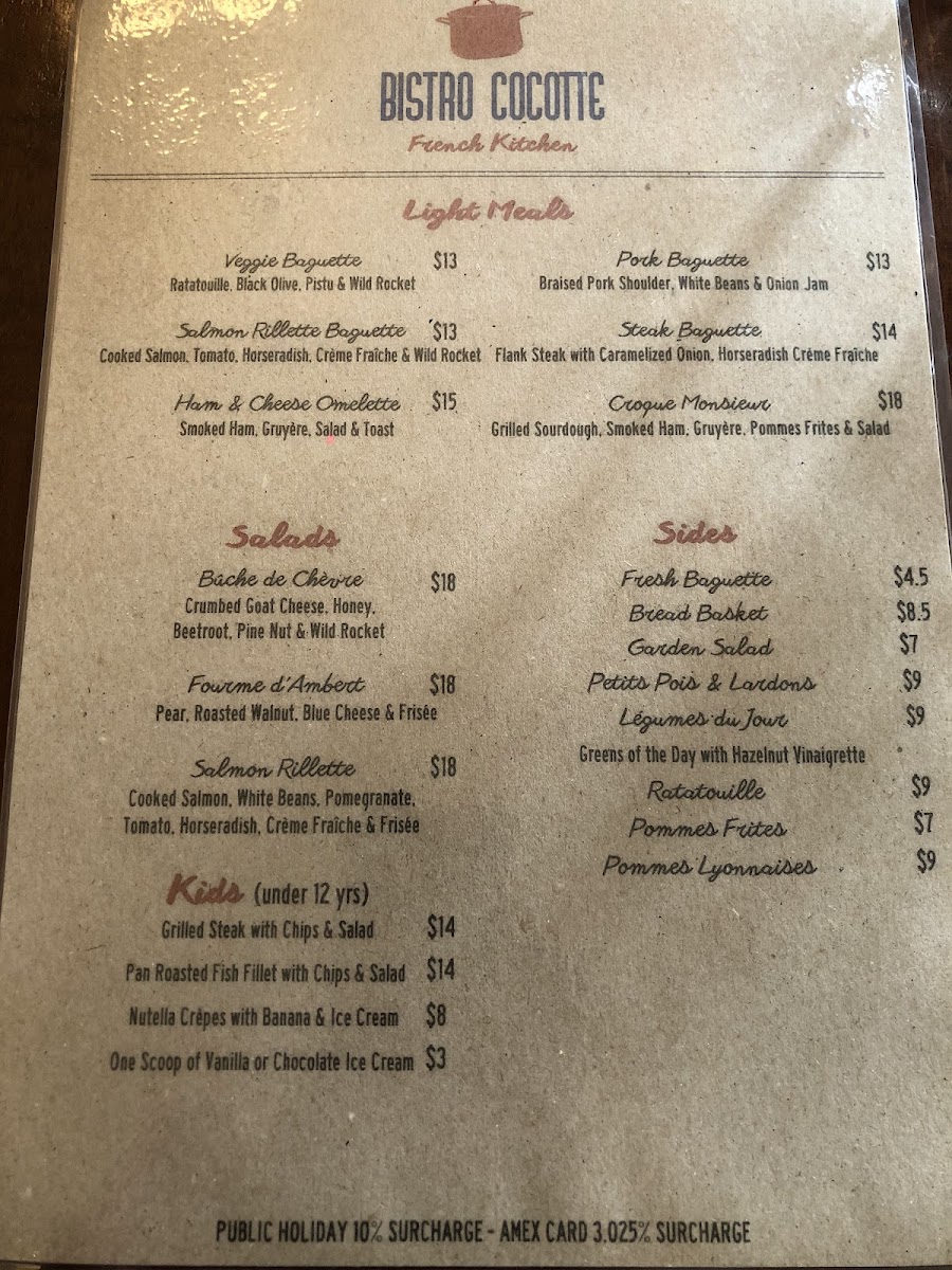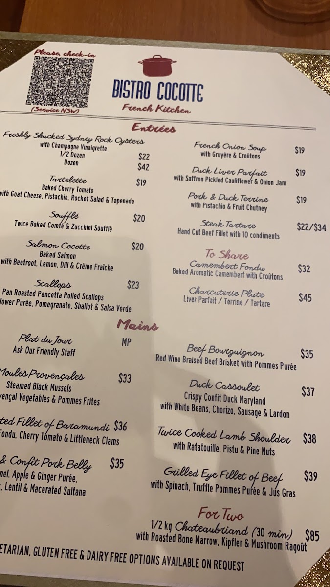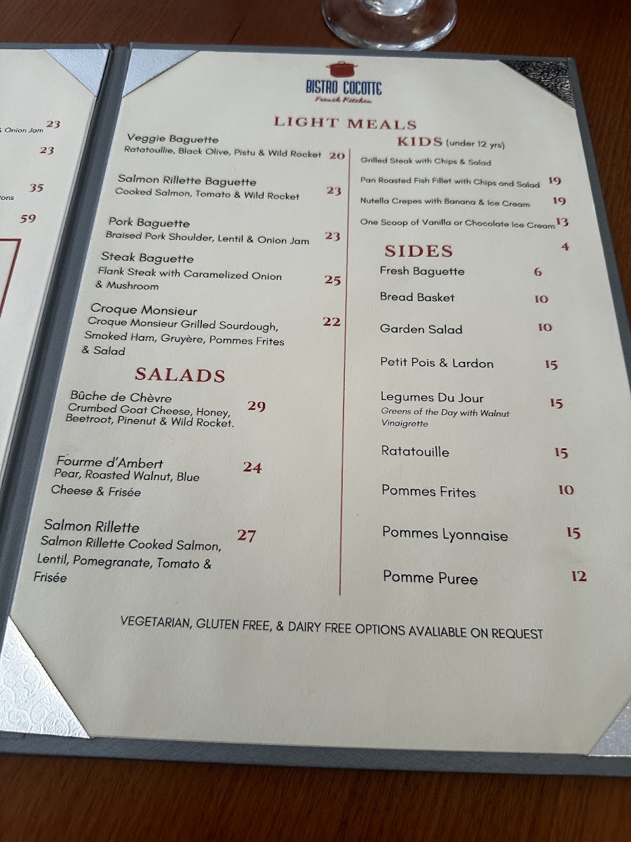 The menu at Bistro Cocotte in Haberfield offers a delightful selection that reflects the rich flavors of French cuisine, perfect for both casual and special dining experiences. For starters, the Tartelette, Soufflé, and French Onion Soup stand out, while the Duck Liver Parfait offers a luxurious option. The mains include classic French dishes like the Plat du Jour, Moules Provençales, and the comforting Salmon Cocotte. For those craving something heartier, the Crispy Confit Pork Belly and Crispy Confit Duck Cassoulet provide satisfying, rich flavors. The light meal options are perfect for a more casual bite, featuring the Veggie Baguette, Salmon Rillette Baguette, and Steak Baguette, among others. In the salad section, the Bûche du Chèvre and Fourme d'Ambert are deliciously paired with fresh ingredients. The kid's menu features familiar favorites, such as Grilled Steak with Chips & Salad and indulgent Nutella Crèpes with Banana & Ice Cream. Side dishes like Garden Salad and Petits Pois & Lardons complete the meal offerings, ensuring that there is something for every palate.