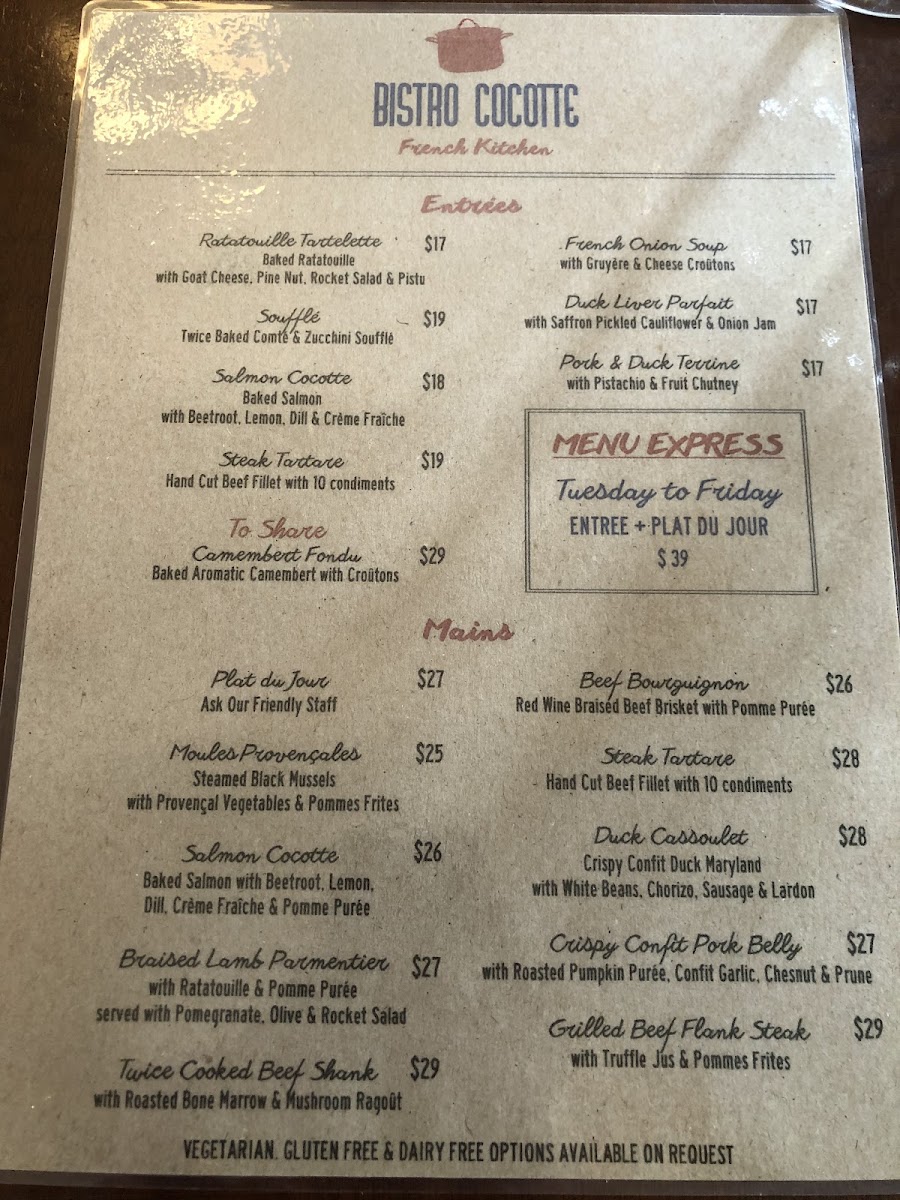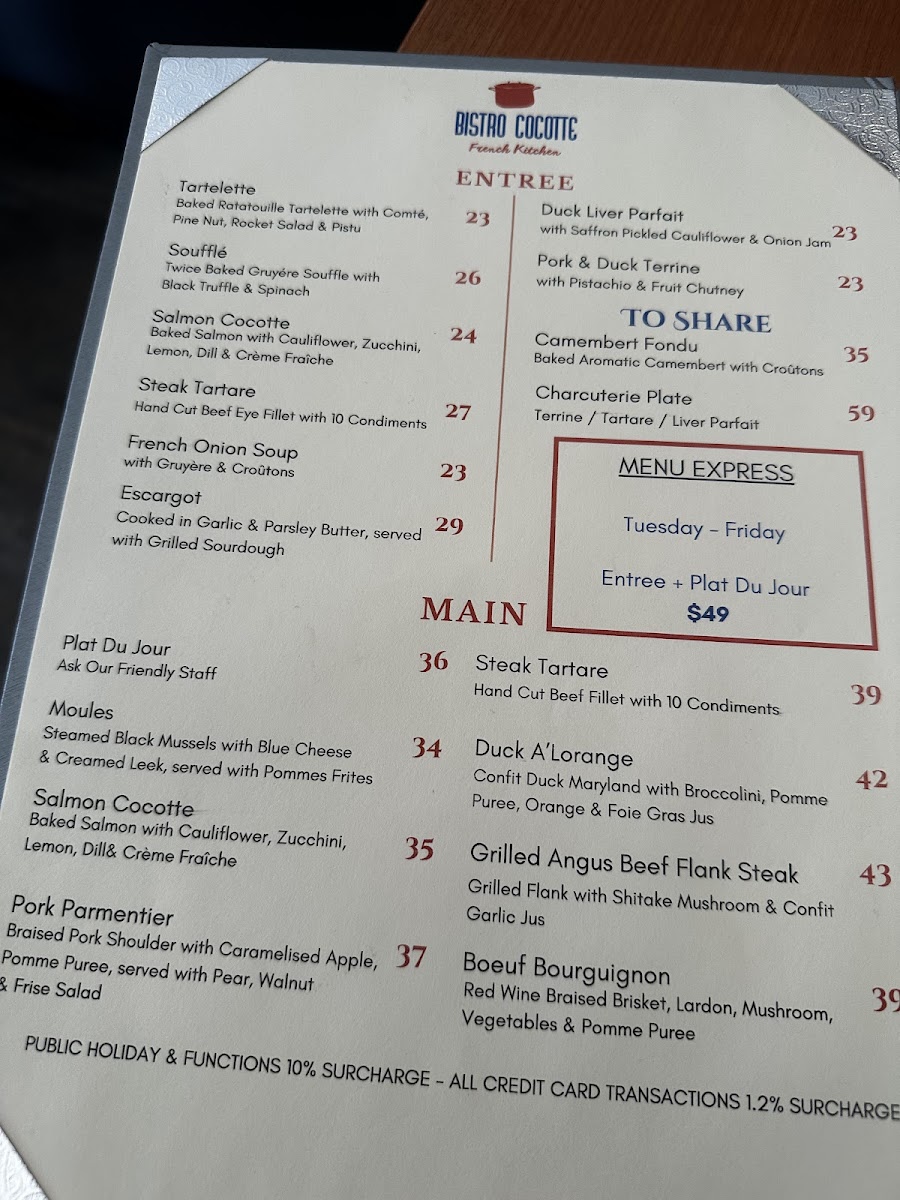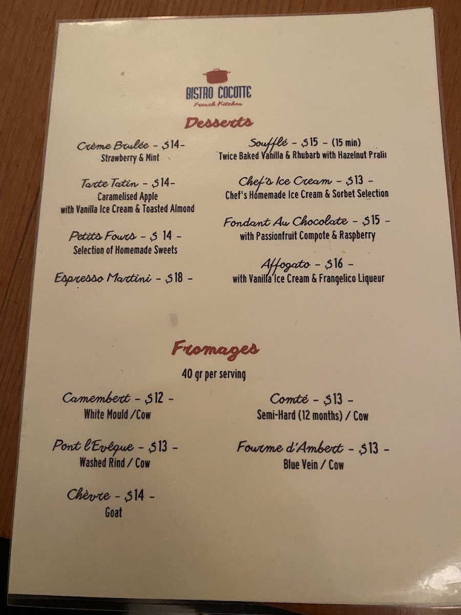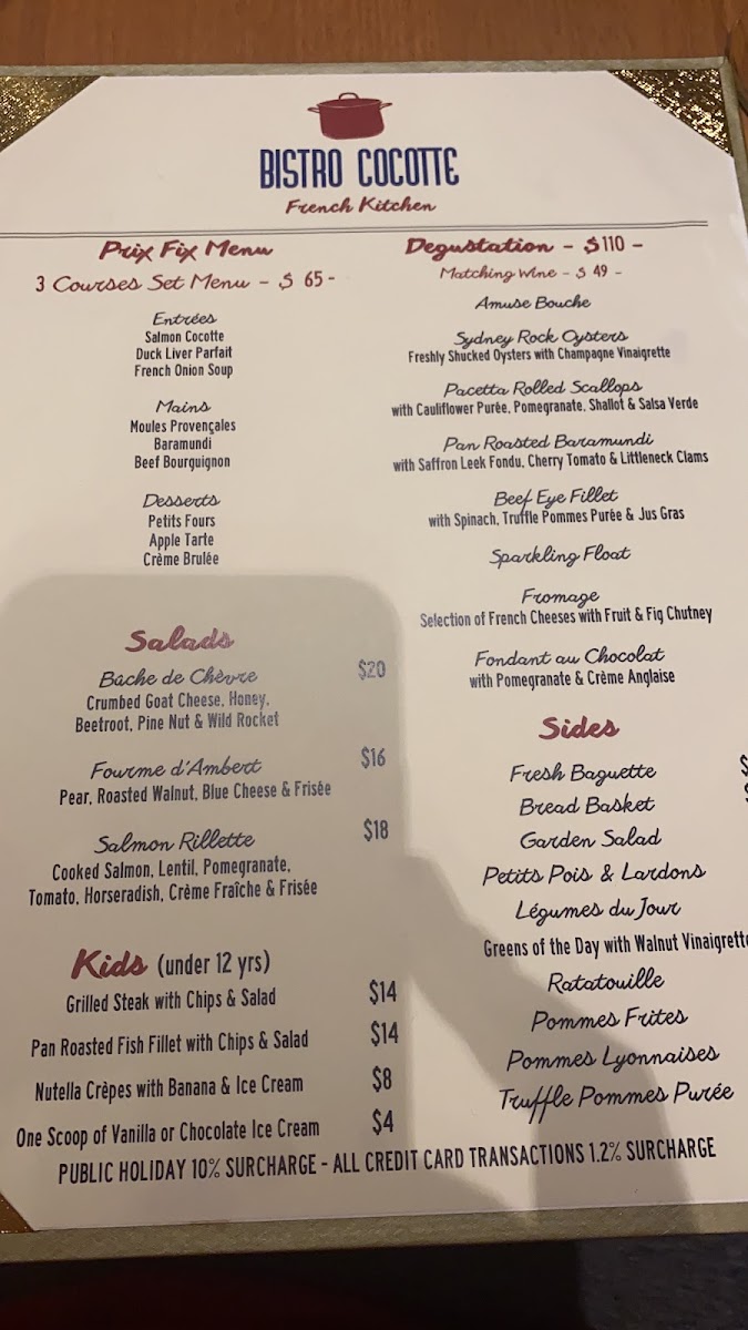 The menu at Bistro Cocotte in Haberfield offers a delightful selection that reflects the rich flavors of French cuisine, perfect for both casual and special dining experiences. For starters, the Tartelette, Soufflé, and French Onion Soup stand out, while the Duck Liver Parfait offers a luxurious option. The mains include classic French dishes like the Plat du Jour, Moules Provençales, and the comforting Salmon Cocotte. For those craving something heartier, the Crispy Confit Pork Belly and Crispy Confit Duck Cassoulet provide satisfying, rich flavors. The light meal options are perfect for a more casual bite, featuring the Veggie Baguette, Salmon Rillette Baguette, and Steak Baguette, among others. In the salad section, the Bûche du Chèvre and Fourme d'Ambert are deliciously paired with fresh ingredients. The kid's menu features familiar favorites, such as Grilled Steak with Chips & Salad and indulgent Nutella Crèpes with Banana & Ice Cream. Side dishes like Garden Salad and Petits Pois & Lardons complete the meal offerings, ensuring that there is something for every palate.